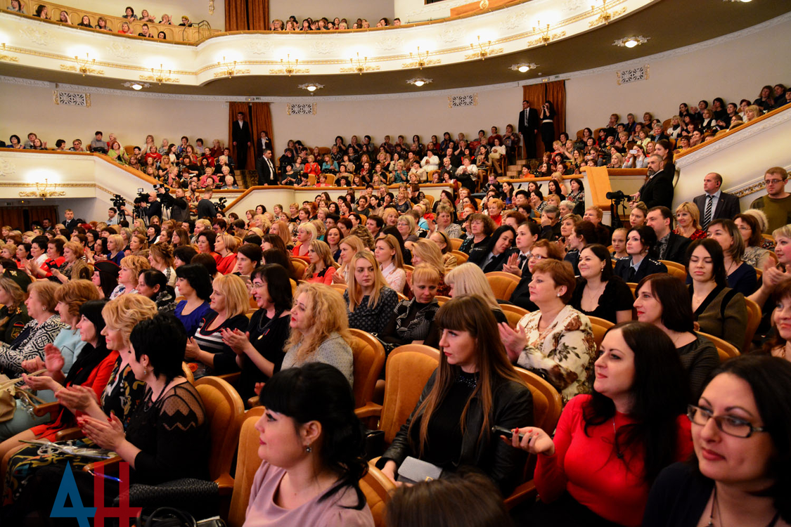Сотрудницы министерств и ведомств, женщины-депутаты, врачи, учителя и работники сельскохозяйственной отрасли ДНР сегодня собрались в Донецком государственном академическом музыкально-драматическом театре на концерт по случаю предстоящего праздника – Международного женского дня. В зале присутствовало около 1000 человек. От имени мужчин Донецкой Народной Республики представительниц слабого пола поздравил Глава ДНР Александр Захарченко. «От чистого сердца хочу сказать: вы те, ради кого живем мы. Я поражаюсь иногда тем вещам, которые вы делаете: ведете домашнее хозяйство, работаете, воюете — у нас много таких. Всего вам самого хорошего, с 8 Марта,» — обратился к к залу лидер Донбасса. После этого началось награждение. Захарченко вручил 56 почетных грамот сотрудницам своей администрации, депутатам Народного Совета, представительницам министерств и ведомств Республики. Среди награжденных также врачи, учителя, работницы сельхоз отрасли, промпредприятий. Помимо грамот руководитель государства каждой женщине преподнес цветы. Торжества завершились концертом. На сцене выступили ведущие творческие коллективы страны.