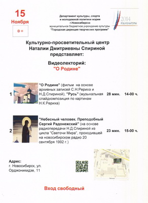 1. Наталия Дмитриевна Спирина - фильм к 100 летию выдающегося общественного и культурного деятеятеля, поэта, мыслителя, прозаика, основателя Рериховского движения в Сибири и Сибирского Рериховского Общества, 28 мин. 16-00 ч.