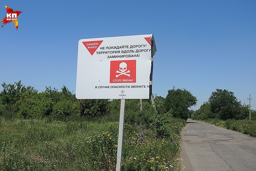 Плакат на дороге "Осторожно, мины! «Фото: ДАРЬЯ АСЛАМОВА