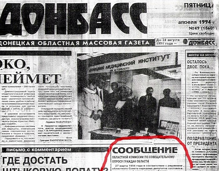 Следовательно, т.н. "независимость" Украины опирается на незаконные решения. Стоит ли удивляться, что народ ее не принимает? И уже в 1994 г. Донбассу была брошена подачка для усмирения. Она цинично называлась "совещательным опросом". Но какой может быть опрос, если проводилось настоящее голосование с бюллетенями? Это был по факту референдум, результаты которого Киевом были попросту проигнорированы.