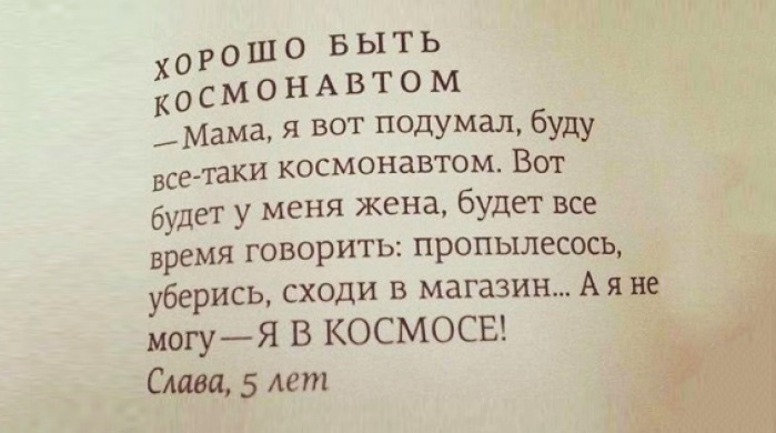 Играем с Алёной в «слова». Ей достаётся слово на букву «Н». Говорит: – Надо. Я ей объясняю: – По правилам, такое слово не принимается, можно только существительные. – Мама, ну как же, ты же сама мне часто говоришь: «Есть такое слово – надо»!