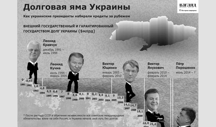 А что же есть? Есть «заявление о намерениях». Почему у них все «приблизительно»? Так это оттого, что разговаривают они с комитетом кредиторов, который в общей сложности является собственником только лишь 9 млрд суверенного украинского долга. А 20% от 9 млрд – это никак не 3,6 млрд, которыми хвалятся Яценюк с Яресько. Это 1,8 млрд. То есть в два раза меньше.