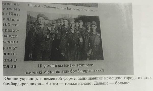 Но грубой карикатурой на российского лидера дело не ограничилось. В учебнике можно встретить и агитку с пилотами Украинской освободительной армии в форме люфтваффе, и уподобление Иосифа Сталина Адольфу Гитлеру. Автор учебного пособия разместил на одной странице плакаты с указывающим вперед Сталиным и с "зигующим" Гитлером. На основании этого Козицкий пишет следующее: