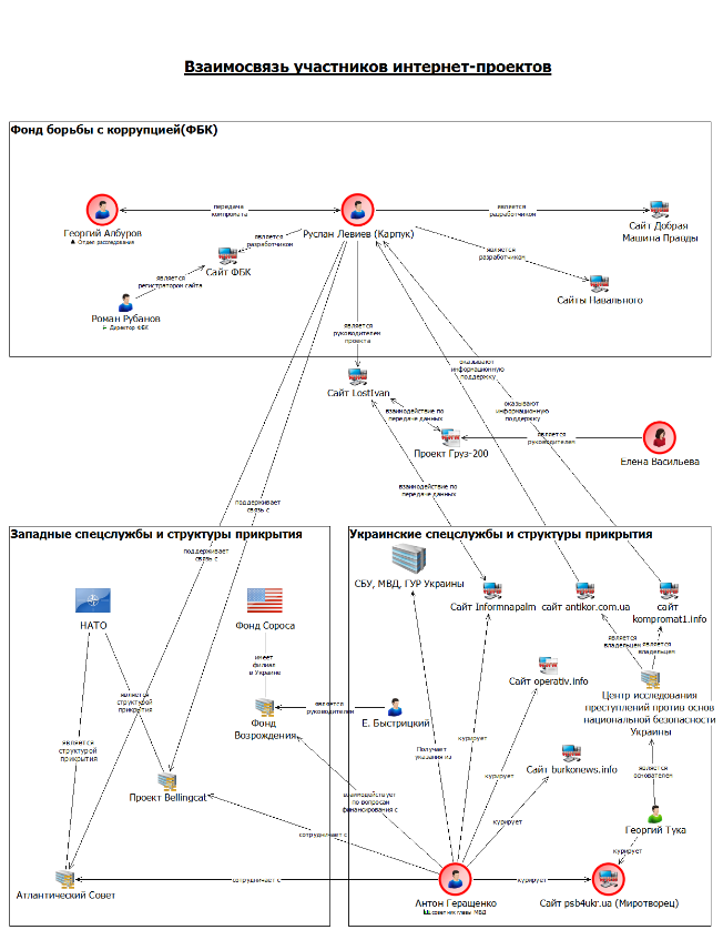 Представляем вам схему взаимосвязей народного депутата Украины и его электронных проектов с российскими правозащитными организациями «Фонд борьбы с коррупцией», «Груз-200″ и «LostIvan»."