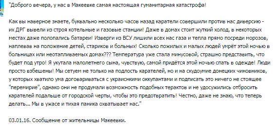 Вот еще мысль приходит, какими же надо быть подонками, чтобы взрывать котельные и газовые трубы в период холодов...?!! ========================== "Жители Макеевки оказались в аду, только не из полымя, а из трескучих морозов. Украинские диверсанты накануне подорвали отопительные станции, в результате чего население города оказалось на грани буквальной смерти. Макеевчане проклинают Украину, и вполне заслуженно, однако, не меньше претензий у них и к властям ДНР, которые с таким чудовищем оформляют «перемирия». Об этом в полном отчаянии написала в соцсетях одна из жительниц города-спутника Донецка. Женщина недоумевает, отчего каратели до сих пор так и не были отброшены как можно дальше от городской черты..."