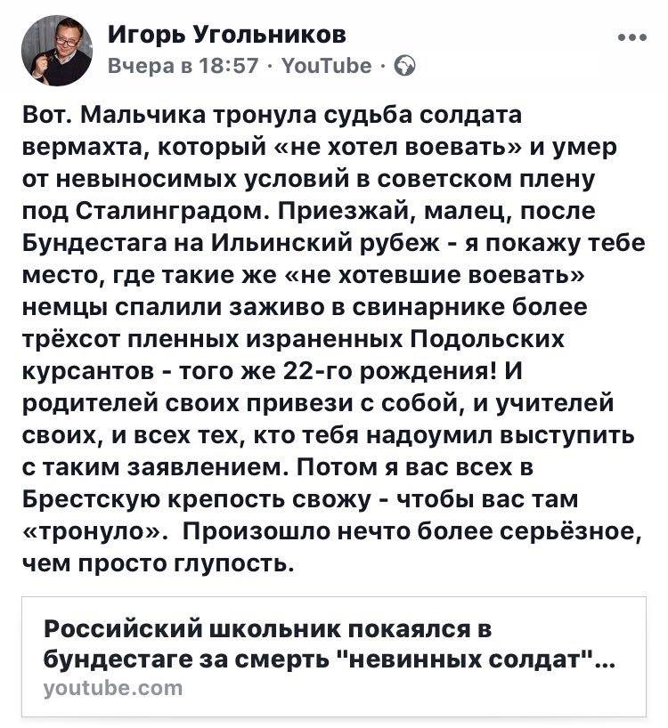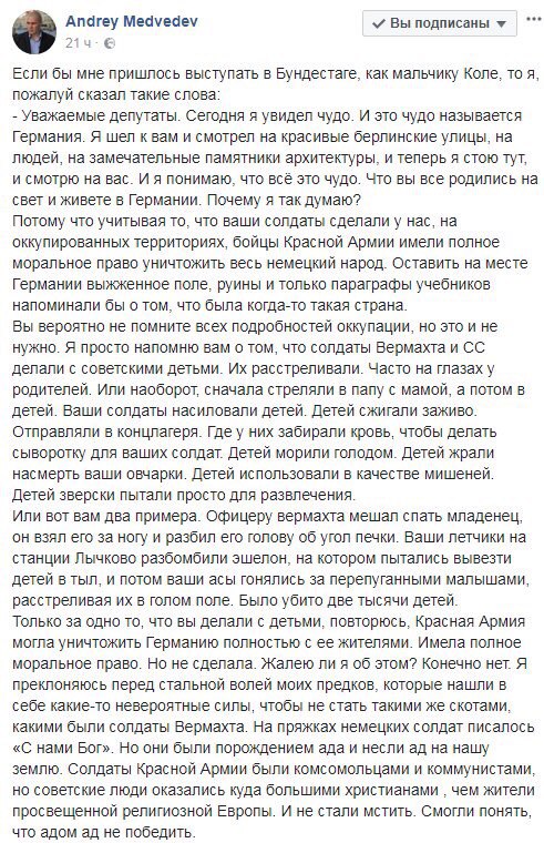 Андрей Медведев, журналист ВГТРК, ведущий программы «Специальный корреспондент», на своей странице в соцсети опубликовал свою версию выступления в Бундестаге в том случае, если бы он был на месте школьника из Нового Уренгоя Николая Десятниченко. Уважаемые депутаты. Сегодня я увидел чудо. И это чудо называется Германия. Я шел к вам и смотрел на красивые берлинские улицы, на людей, на замечательные памятники архитектуры, и теперь я стою тут, и смотрю на вас. И я понимаю, что всё это чудо. Что вы все родились на свет и живете в Германии. Почему я так думаю? Потому что, учитывая то, что ваши солдаты сделали у нас, на оккупированных территориях, бойцы Красной Армии имели полное моральное право уничтожить весь немецкий народ. Оставить на месте Германии выжженное поле, руины и только параграфы учебников напоминали бы о том, что была когда-то такая страна. Вы вероятно не помните всех подробностей оккупации, но это и не нужно. Я просто напомню вам о том, что солдаты Вермахта и СС делали с советскими детьми. Их расстреливали. Часто на глазах у родителей. Или наоборот, сначала стреляли в папу с мамой, а потом в детей. Ваши солдаты насиловали детей. Детей сжигали заживо. Отправляли в концлагеря. Где у них забирали кровь, чтобы делать сыворотку для ваших солдат. Детей морили голодом. Детей жрали насмерть ваши овчарки. Детей использовали в качестве мишеней. Детей зверски пытали просто для развлечения. Или вот вам два примера. Офицеру вермахта мешал спать младенец, он взял его за ногу и разбил его голову об угол печки. Ваши летчики на станции Лычково разбомбили эшелон, на котором пытались вывезти детей в тыл, и потом ваши асы гонялись за перепуганными малышами, расстреливая их в голом поле. Было убито две тысячи детей. Только за одно то, что вы делали с детьми, повторюсь, Красная Армия могла уничтожить Германию полностью с ее жителями. Имела полное моральное право. Но не сделала. Жалею ли я об этом? Конечно нет. Я преклоняюсь перед стальной волей моих предков, которые нашли в себе какие-то невероятные силы, чтобы не стать такими же скотами, какими были солдаты Вермахта. На пряжках немецких солдат писалось «С нами Бог». Но они были порождением ада и несли ад на нашу землю. Солдаты Красной Армии были комсомольцами и коммунистами, но советские люди оказались куда большими христианами, чем жители просвещенной религиозной Европы. И не стали мстить. Смогли понять, что адом ад не победить. Вам не стоит просить у нас прощения, ведь лично вы ни в чем не виноваты. Вы не можете отвечать за своих дедов и прадедов. И потом, прощает только Господь. Но я скажу честно – для меня немцы навсегда чужой, чуждый народ. Это не потому что лично вы плохие. Это во мне кричит боль сожженных Вермахтом детей. И вам придется принять, что как минимум еще моё поколение — для которого память о войне это награды деда, его шрамы, его фронтовые друзья — будет воспринимать вас так. Что будет потом, я не знаю. Возможно, после нас придут манкурты которые все забудут. И мы многое для этого сделали, мы много что потеряли сами, но я надеюсь, что еще не все потеряно для России. Нам конечно нужно сотрудничать. Русским и немцам. Нужно вместе решать проблемы. Бороться с ИГИЛ (структура запрещена в РФ – ред.) и строить газопроводы. Но вам придется принять один факт: мы никогда не будем каяться за нашу Великую эту войн