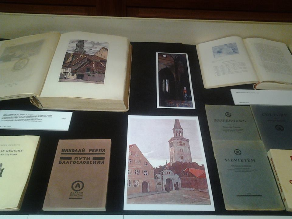 На основе сделанных в поездке этюдов (около 100) была организована большая выставка. Потом они поехали на выставку в Америку и там из-за каких-то формальностей этюды были распроданы, поэтому разошлись по миру. Но в Америке тоже жили друзья Рерихов, и одна из них, состоятельная женщина, скупила довольно много этих работ, а потом подарила их Москве, Музею Востока. Сейчас часть серии хранится там. В том числе, «Интерьер Домского собора» и «Развалины капеллы в Вендене» (Цесисе). И еще Рерих с женой побывали в Латвию в 1910 году. Уникальный экспонат выставки — одна из самых больших ранних монографий о Рерихе. Вышла книга в Петрограде в 1916 году и была проиллюстрирована его работами. Среди них и городской пейзаж с видом на рижскую церковь Петра и домик Конвента. Работа пропала, но сохранилась в этом цветном изображении. Выставлены также издания Общества Рериха, письма Елены Рерих. И первая вышедшая в Риге книга Николая Рериха, «Пути благословения». У Шибаева был книжный магазин по эзотерической литературе, вокруг которого образовалась группа интересующихся восточной философией. И вот по инициативе Шибаева, а также по желанию самого Рериха, была выпущена эта книжка.
