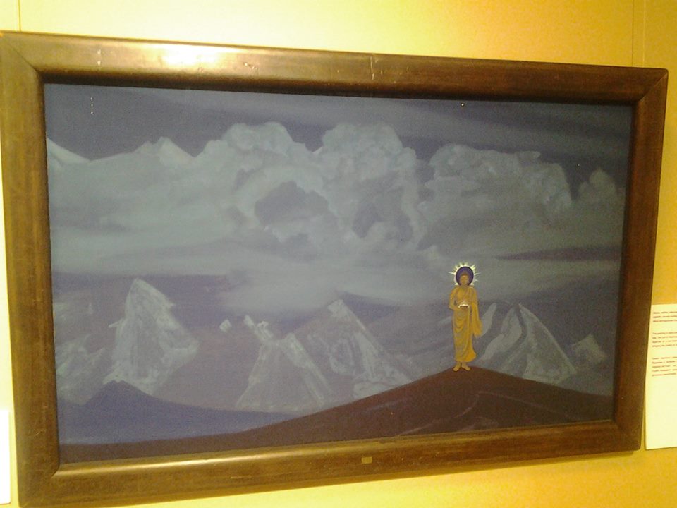 Материал — и медное покрытие, и гипс, и шамот. . К центральному отделу выставки прямо от входа в зал выстроен импровизированный солнечно-желтый коридор, с цитатами из Николая Рериха, с символикой «Знамени мира». В его конце — синее сияние знаменитого полотна «Путь». В конце «коридора», по обе его стороны, открывается сверкающий мир рериховской живописи. Солнечно-желтый — символически можно трактовать как пронизывающую пространство энергию, как тепло, солнце — ведь в картинах этого мастера тоже часто встречаются акценты желтого. — Тут многие живописные работы из постоянной экспозиции ЛНХМ, рассказывает Ксения Рудзите. — Но выставлен и достаточно ранний, датированный 1924 годом, рисунок, выполненный, когда семья Рерихов жила еще в Дарджилинге, в северной горной части Индии в Гималаях. Это « Цонг-Ка-Па», зарисовка с тибетской статуэтки, изображающая одного из основателей тибетского направления буддизма. Рерихи собирали тибетскую пластику. А «Путь» — удивительная картина, здесь подчеркнуто движение в глубину. Рерих и в школе преподавал композицию, и придавал огромное значение композиции как таковой, включая не только расположение предметов, но и красочные цветовые пятна, колорит, подчиненные определенной цели. И здесь глаз зрителя не останавливается, а куда-то уходит, уходит, растворяется в пространствах гималайских.